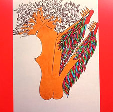 This canvas represents a couple in a deep connection, yet at the same time the fullness of love experienced like a melody when two people kiss. The flowers and stylized organic vegetation emanate from an imaginary and sublime garden. One can see vibrant notes of music filled with emotion on the body. 500 euro.